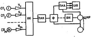 Аэрогеофизические, сейсморазведочные, электроразведочные и каротажные станции - это многоканальные системы цифровой регистрации с возможностью визуализации результатов измерений, т. е. они совмещают в себе преобразователи аналог - код и код - аналог. В то же время всем этим системам присуща многоканальность с регистрацией либо однородной информации (сейсмостанции), либо различных физических полей (аэрогеофизические и каротажные станции). Однако принципиальная схема для всех указанных систем по существу одинакова (рис. 3). От источников регистрации информации СП (сейсмоприемники в сейсморазведке, датчики в виде заземленных диполей, статических магнитометров и многовитковой петли в электроразведке, зонды различных конструкций в каротаже) сигналы поступают в тракт регистрации, началом которого являются, как правило, широкополосные аналоговые предварительные усилители У с фильтрами. Далее выходы усилителей подаются на коммутатор каналов КК (мультиплексор), обеспечивающий квантование сигналов по времени путем последовательного циклического опроса всех каналов с определенной частотой и производящий временное уплотнение каналов (мультиплексирование) с одновременным их подключением к преобразователю аналог - код (ПАК).