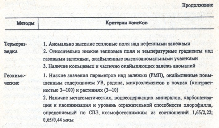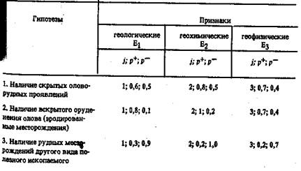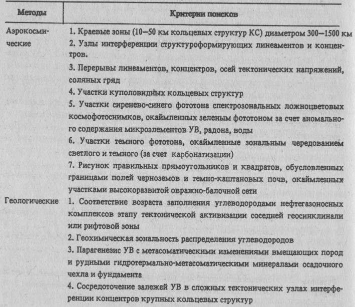 На примере прогноза нефтегазоносности, осуществляемого комплексом аэрокосмических, наземных, геохимических и геофизических исследований, Г. П. Попсуй-Шапко составлена таблица поисковых признаков и критериев, отражающих многофакторный характер моделей нефтегазоносных объектов.