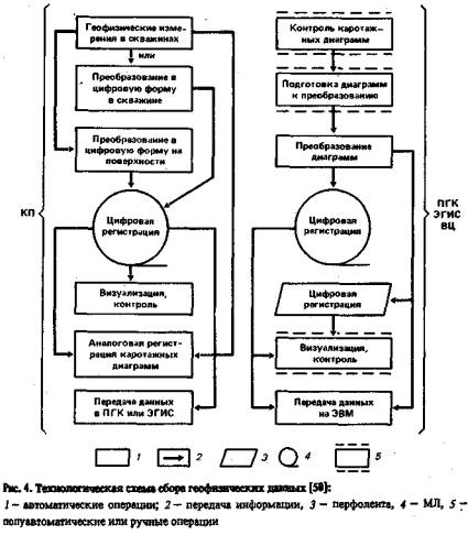 Как и в других методах разведочной геофизики, сбор экспериментальных данных при геофизических исследованиях скважин (ГИС) включает: 1) преобразование данных в цифровую форму и их запись на магнитную ленту (МЛ) или перфоленту (ПЛ) для последующего ввода в ЭВМ; 2) передачу информации от каротажной партии (КП) в вычислительные центры экспедиций; 3) контроль цифровых данных и обеспечение их ввода в ЭВМ (рис. 4).