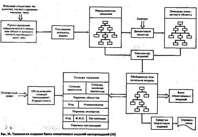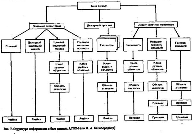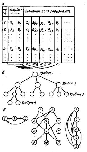 1) создание баз данных и баз знаний по различным типам многофакторных моделей геообъектов (и геопроцессов) с обеспечением долговременного их хранения и накопления. При этом необходимо вести разработки по совершенствованию, унификации и стандартизации форм представления разнородных геоданных. Создаваемая в ЗапСибНИГНИ Н. А. Гольдиной система документации геологоразведочных работ на уровне геофизических экспедиций и предложенная ею матричная модель информационного отображения процессов изучения геообъектов могут быть положены в основу при создании указанных баз данных. Следует предусмотреть возможность расширения различного рода геологической информации, заносимой в базу для последовательного и многоцелевого использования, а также применения таких способов кодирования первичных материалов, которые не приводят к потере исходной информации при ее последующем анализе на ЭВМ. Очень важен вопрос о схеме описания многофакторных моделей геообъектов. В настоящее время используются в основном три схемы: первая состоит в описании на исследуемой площади множества отдельных точек (месторождений, рудопроявле-ний, скважин) или выборе небольших участков вокруг таких точек (составление кадастров). При этом подходе картографические геологические данные не используются для выявления количественных закономерностей размещения перспективных геообъектов.