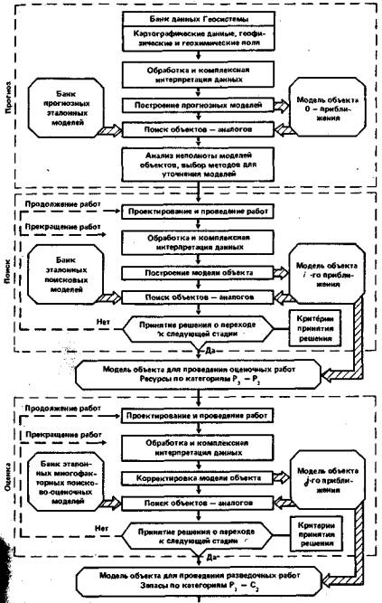 Генетический подход выражается в построении модели гее логического процесса образования объекта и установлении для такой модели критериев и признаков, которые являются решающими для выявления, обнаружения объекта. Парагенетический подход представляет собой обобщение данных по известным объектам того же родя что и объект поисков, и установление статистическими приемами наиболее характерных для него признаков и критериев, набор которых зависит от уровня зондирования. Построение ППМ обычно ограничивается качественным описанием поисковых признаков и критериев, а содержание ППМ в значительной степени определяется конкретным видом минерального сырья. Комплексирование аэрокосмических, наземных и скважинных геолого-геофизических методов поисков позволяет установить признаки и критерии, лежащие в основе ППМ и ФГМ.