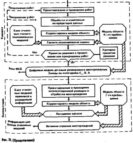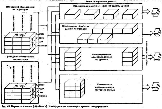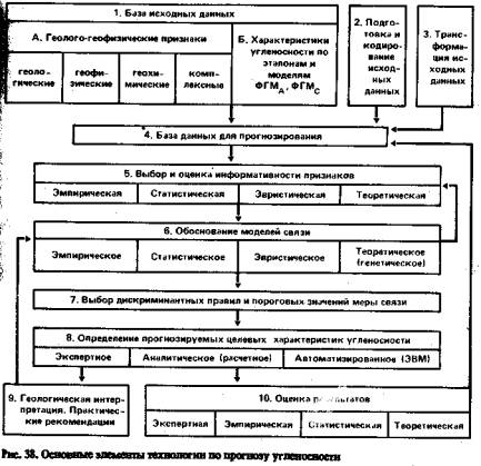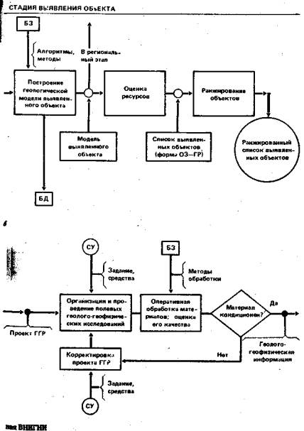 Для того чтобы по данным наблюдений определять структуру геологических объектов, создают проблемно-ориентированные системы обработки и интерпретации геоданных (см. гл. IV). Результаты обработки и интерпретации дополняют базу исходных данных. В процессе обработки и в результате моделирования могут быть установлены новые характерные особенности геополей для прогноза изучаемых объектов. Выявленные особенности геополей совместно с неформализованными логическими утверждениями и эмпирическими правилами образуют базу знаний.