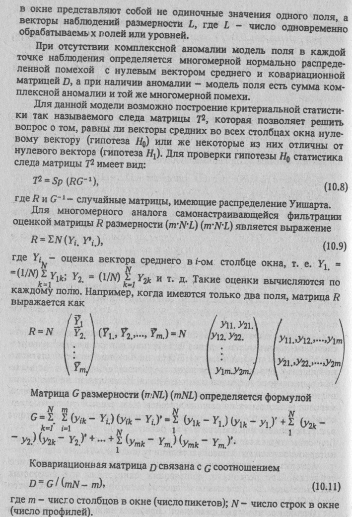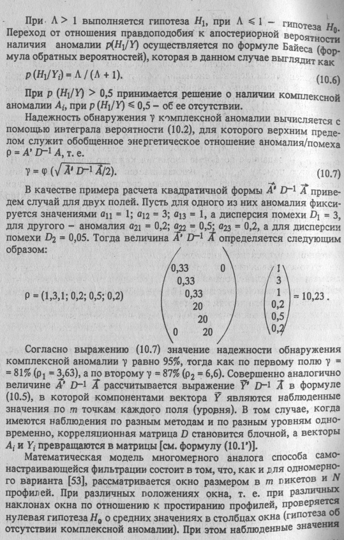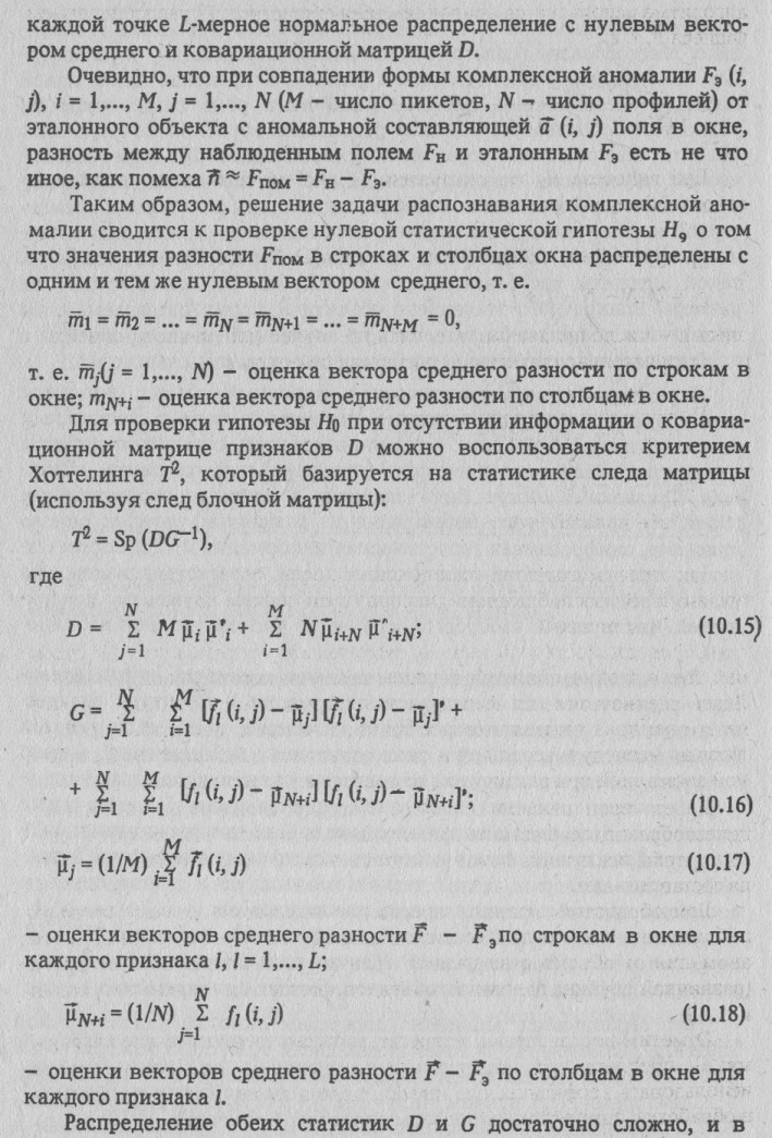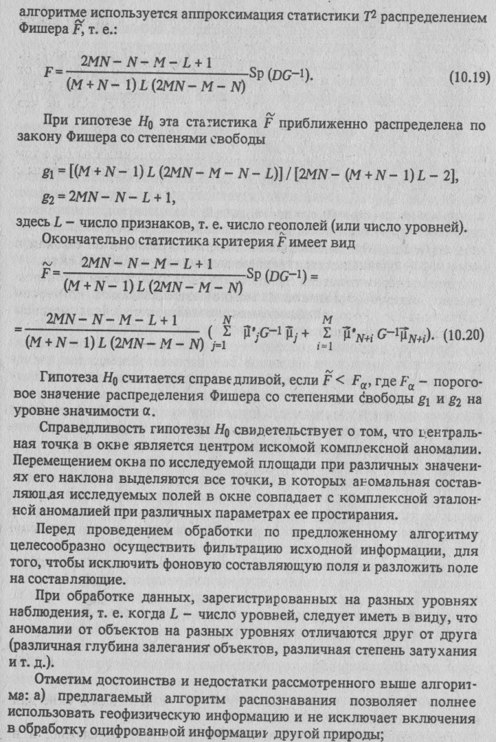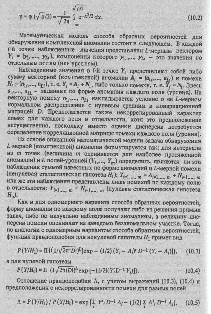 При сравнении нескольких альтернативных ФГМ в качестве модели, адекватной реальной среде, принимается такая, для которой величина обобщенного расстояния (10.36) является наименьшей. Такой подход обеспечивает построение модели, которая, возможно и грубо, но согласуется с данными всех методов. Это обстоятельство существенно при физико-геологическом моделировании по геофизическим полям, поскольку по экспериментальным данным одного метода всегда можно подобрать модель, для которой теоретически рассчитанные значения со сколь угодно высокой точностью совпадут с наблюденными значениями, однако для другого метода эта же модель уже может быть нереальной.