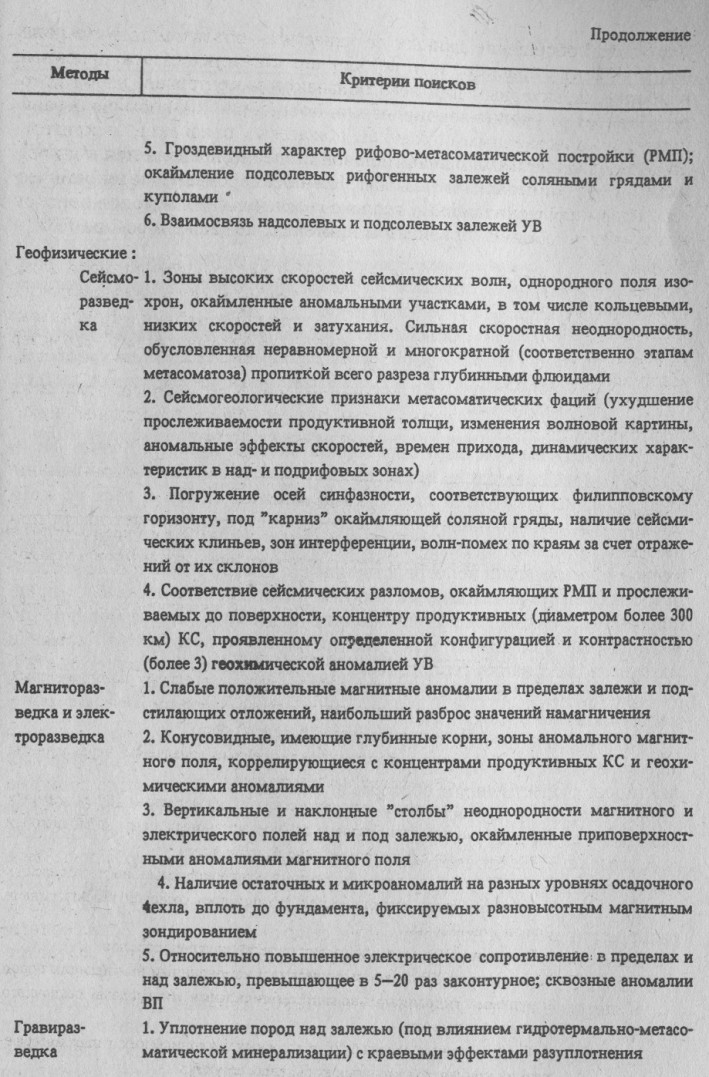 Геолого-геофизические критерии поисков метасоматических залежей углеводородов (УВ), по Г. П. Попсуй-Шапко, приведены ниже.