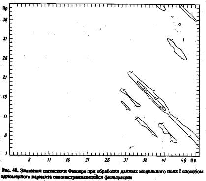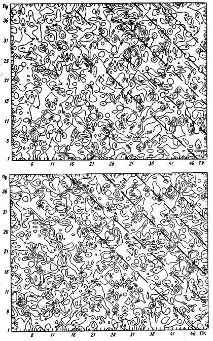 Как и следовало ожидать, пересчет поля f2 в нижнее полупространство, по сравнению с пересчетом поля f1, дает большее число особых точек, однако неоднозначность их определения, за исключением двух-трех, остается высокой. В то же время применение компенсационного фильтра и дальнейший пересчет разности (10.30) в нижнее полупространство (рис. 53) позволяет не только осуществить более однозначную оценку особых точек, но и выделить ряд новых, которые не были обнаружены при пересчете исходных полей f1 и f2.