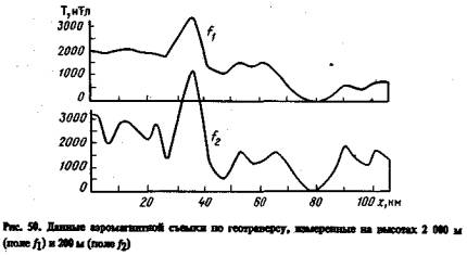 На рис. 51-54 приведены результаты обработки данных f1 и f2 (см. рис. 50) разновысотной аэромагнитной съемки, выполненной по геотраверсу на территории Северного Казахстана.