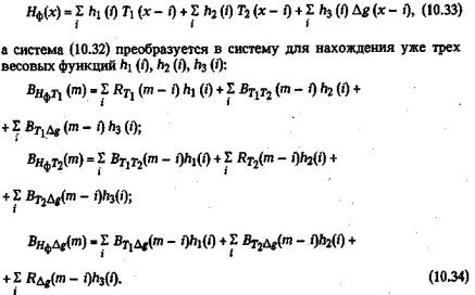 залегания определяется на некотором (эталонном) интервале другим геофизическим методом, например, сейсморазведкой, или на тех участках, где эта глубина известна по данным бурения. Аналогичный подход может быть реализован как при наблюдениях одного типа поля на трех уровнях [но при этом в уравнении (10.31) для Hф (х) добавляется еще одна свертка], так и при наблюдениях нескольких полей на разных высотах. Например, если при тех же наблюдениях полей T1 и Т2 провести дополнительно измерение поля Dg на поверхности земли, то уравнение (10.31) примет вид