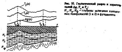 Для оценки глубины залегания контактной поверхности в осадочном чехле (рис. 55) в выражениях (10.33) и (10.34) значения Hф следует заменить на Hk, соответственно для оценки глубины залегания некоторой другой поверхности - значения Hф заменяют на глубины этой поверхности.