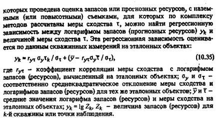 При решении прогнозно-поисковых задач в каждой точке (ячейке) наблюдения по данным комплекса геофизических методов вычисляется значение меры сходства. Используя приведенную регрессионную зависимость (10.35), в той же точке оценивают величину запасов или прогнозных ресурсов. Эта оценка будет значима при условии, что yk вдвое превышает величину ryt.