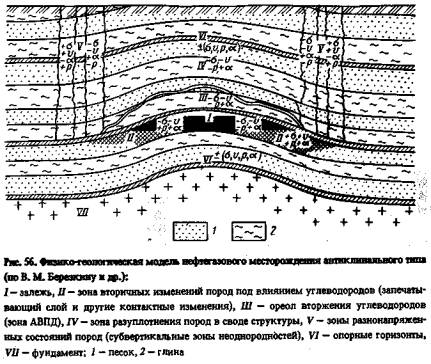 Другим примером многофакторной модели может служить физико-геологическая модель нефтегазового месторождения антиклинального типа, используемая для прямых поисков нефти и газа по комплексу наземных геофизических методов. Еще двадцать лет назад при решении проблемы прямых поисков основное внимание концентрировалось на выявлении непосредственных (прямых) эффектов нефтегазовых залежей из наблюдаемых геофизических полей, поскольку предполагалось, что залежь представляет отдельное, изолированное по физическим свойствам тело. Накопленные к настоящему времени материалы по физико-геологическому моделированию свидетельствуют о сложном распределении физических свойств пород в пределах месторождений нефти и газа.