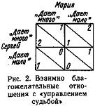 Существуют две широкие разновидности власти. Первую мы назвали управление судьбой (Упр. С). Если, варьируя свое поведение, партнер А оказывает влияние на результаты В независимо от того, что делает В, А управляет судьбой В. Если каждый обладает такого рода властью, получается модель взаимного управления судьбой (ВУС). Для иллюстрации такой модели ВУС историей Марии и Сергея рассмотрим самую раннюю стадию их супружества. Каждый хотел больше всего дарить любовь и внимание другому, каждый охотно дарил и радостно получал “постоянную взаимную любовь”. На рис. 2 представлены эти взаимно благожелательные отношения. Когда оба “дают много”, оба получают свои наилучшие результаты, и их результаты всегда выше, чем в случае, если кто-нибудь выберет вариант “дает мало”. Так выбор каждого из партнеров влияет на счастье другого. (Каждый также получает удовольствие от того, что “дает много” другому; как мы покажем ниже, эта матрица включает также двустороннее возвратное управление.) Возможность давать мало, которая произвела бы низкий результат для обоих партнеров, без сомнения, настолько нехарактерна, что ее едва ли стоит рассматривать.
