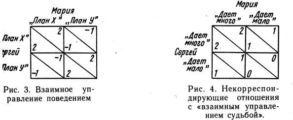 Модели взаимозависимости, показанные на рисунках 2 и 3, отражают гармонию ранней стадии отношений между Марией и Сергеем. Их результаты согласованы: они положительно коррелируют по элементам матрицы. Что хорошо для одного, то хорошо и для Другого, а что плохо — плохо для обоих. У них общая судьба. По мере того как разворачиваются события, начинает развиваться конфликт между Марией и Сергеем. В городе светские обязанности так чрезмерно захватывают Марию, что Сергей оказывается как бы в стороне, он же тем не менее “остается преданным ей”. Модель ВУС, представленная на рис. 2, по мере того как Мария перестает интересоваться исключительно Сергеем, превращается в модель, представленную на рис. 4. Светские обязанности Марии приводят к тому, что она предпочитает “давать мало” Сергею, от которого сама продолжает получать поддержку во всех своих делах. Возможно, Сергей мог бы прибегнуть к угрозе также “давать мало”, но как видно из рис. 4, выполнить это было бы для него крайне мучительно. Модель на рис. 4 уже не гармонична: появился сильный элемент несоответствия результата.
