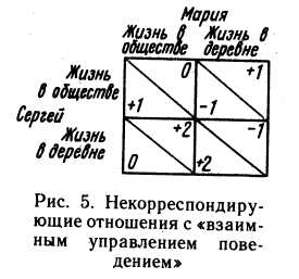 Отсутствие соответствия может произойти также и в моделях взаимного управления поведением. Предположим, что отчуждение Марии и Сергея зашло значительно дальше. Она предпочитает жизнь в обществе, а он — жизнь в деревне. Но чего бы ни желал Сергей, для него значительно важнее было бы жить с Марией, в то время как она скорее бы жила без него. Как показано на рис. 5, лучший результат для него получился бы, если бы они жили вместе в деревне, а для нее лучший результат — жизнь в обществе без него. Результаты каждого были бы крайне зависимы от поведения другого и в такой же степени некорреспондирующими.