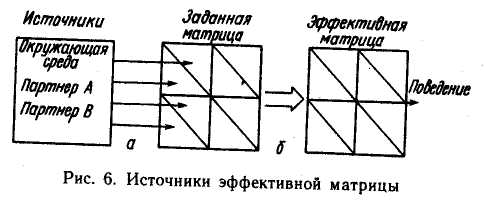 Не существует тесной причинной связи между заданной матрицей и поведением, которое она определяет. Как мы уже говорили, результаты, определенные по отдельности, элемент за элементом, как в заданной матрице, не объясняют поведение в отношениях взаимозависимости. То, на что участники часто действительно реагируют, — это на модель заданной матрицы, например, на несоответствие между их собственным результатом и результатом партнера в данном элементе матрицы, на тот факт, что в определенных элементах матрицы оба результата высоки или на возможность выбора между различными по предпочтительности элементами. В результате, реагируя на разные стороны модели заданной матрицы, участники трансформируют ее в новую матрицу — эффективную матрицу, которая уже тесно связана с их поведением.