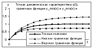 На рисунке приведена точная переходная характеристика объекта y(t), верхняя и нижняя граничные функции ymin(n) и ymax(n). Очевидно, что истинные значения характеристики лежат в интервалах, построенных интервальным модифицированным методом Висковатова.