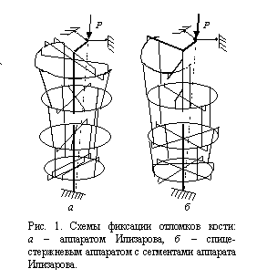 стержневым аппаратом с сегментами аппарата Илизарова (рис.2, а),