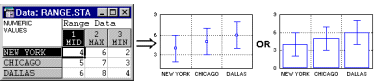 2М диаграммы размаха - Столбцы ошибок. На статистических 2М диаграммах размаха такого типа диапазоны или столбцы ошибок вычисляются по данным. Центральная тенденция (например, медиана или среднее) и диапазон или вариационные статистики (например, значения минимума и максимума, квартили, стандартные ошибки или стандартные отклонения) вычисляются для каждой переменной, и выбранные значения представляются в виде столбцов ошибок.