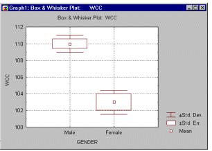 2М диаграммы размаха - Прямоугольники - Отрезки. На диаграммах размаха этого типа вокруг средней точки (т.е. среднего или медианы) рисуются прямоугольник, представляющий выбранный диапазон (т.е. стандартную ошибку, стандартное отклонение, минимум-максимум или константу), и отрезок, также отражающий выбранный диапазон, концы которого расположены вне прямоугольника (см. следующий рисунок).