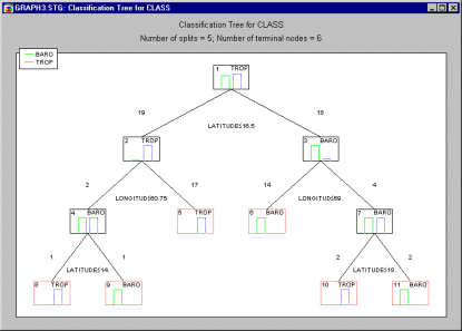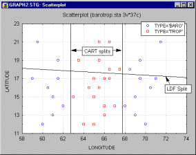 График ясно показывает, что нет отчетливой линейной связи между переменными широты, долготы или какой-либо их линейной комбинацией с одной стороны, и переменной Class - с другой. Переменная Class функционально не связана с долготой и широтой, по крайней мере, в линейном смысле. На графике показана попытка ветвления посредством LDF (линейной дискриминантной функции): циклоны, относительно которых делается прогноз Trop, находятся над линией ветвления, а прогнозируемые как Baro - под этой линией. Хорошо видно, что получился почти что "выстрел наугад". Возможности одномерного ветвления CART не ограничены вычислением единственной линейной комбинации широты и долготы, и этот метод находит "критические значения" переменной Longitude , позволяющие получить наилучшую возможную (а в данном случае - идеальную) классификацию для переменной Class.