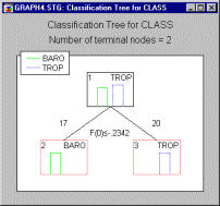 Дерево классификации для переменной Класс - Class, построенное с использованием Дискриминантных одномерных ветвлений, дает почти такие же результаты. В приведенной ниже таблице результатов Структура дерева для этого варианта анализа константы ветвления равны -63.4716 и -67.7516 - то есть почти те же, что получились в варианте Полного перебора деревьев с одномерным ветвлением по методу CART . Здесь, однако, один циклон класса Trop в терминальной вершине 2 неправильно классифицирован как Baro.