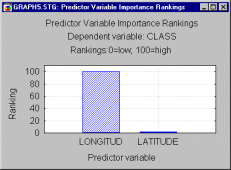 Если делаются одномерные ветвления, то каждой предикторной переменной можно приписать ранг по шкале от 0 до 100 в зависимости от степени ее влияния на отклик зависимой переменной. В нашем примере очевидно, что Долгота - Longitude имеет большую важность, а Широта - Latitude - относительно небольшую.