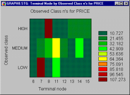 Деревья классификации могут быть, а иногда и бывают очень сложным. Однако использование специальных графических процедур, позволяет упростить интерпретацию результатов даже для очень сложных деревьев. Если пользователя интересуют прежде всего условия попадания объекта в один определенный класс, например, в класс с высоким уровнем отклика, он может обратиться к специальной дискретной Карте линий уровня , показывающей, к какой из терминальных вершин дерева классификации отнесены большинство наблюдений с высоким уровнем отклика.