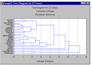 В результате, вы связываете вместе всё большее и большее число объектов и агрегируете (объединяете) все больше и больше кластеров, состоящих из все сильнее различающихся элементов. Окончательно, на последнем шаге все объекты объединяются вместе. На этих диаграммах горизонтальные оси представляют расстояние объединения (в вертикальных древовидных диаграммах вертикальные оси представляют расстояние объединения). Так, для каждого узла в графе (там, где формируется новый кластер) вы можете видеть величину расстояния, для которого соответствующие элементы связываются в новый единственный кластер. Когда данные имеют ясную "структуру" в терминах кластеров объектов, сходных между собой, тогда эта структура, скорее всего, должна быть отражена в иерархическом дереве различными ветвями. В результате успешного анализа методом объединения появляется возможность обнаружить кластеры (ветви) и интерпретировать их.
