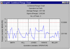 R и S карты. В разделе Контроль качества подробно обсуждается концепция R(размах) и S(сигма) карт для контроля за изменчивостью процесса. Можно применить эти концепции в данной ситуации и построить график размахов (или сигм) для операторов и деталей; эти графики позволят выявить сильные отклонения (выбросы) среди операторов и деталей. Если какой-нибудь оператор дает особенно большой разброс измерений, вам захочется выяснить, почему именно у него возникли трудности с получением надежных результатов (например, возможно, он неправильно понял инструкции по использованию измерительного прибора).
