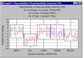 Итоговый график повторяемости и воспроизводимости. На итоговом графике показаны индивидуальные измерения, сделанные каждым инженером (оператором). Измерения представлены отклонениями от соответствующих средних значений для соответствующей детали. Каждое измерение показано на графике в виде точки, а результаты опытов, проведенных для каждой детали конкретным оператором, соединены вертикальными линиями. Точки, представляющие сделанные каждым инженером измерения, заключены в прямоугольник ("ящик"), показывающий общий разброс измерений, сделанных соответствующим оператором (см. следующий рисунок).